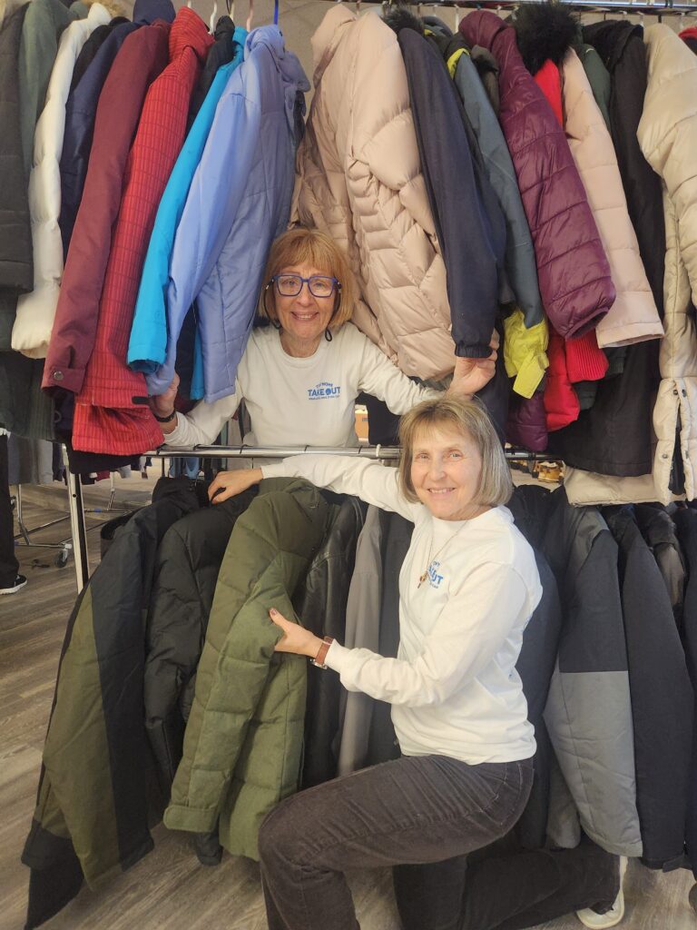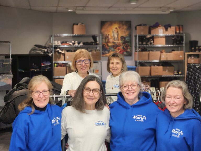 Donations can be dropped off in the hall at Tiny Home Takeout — or inside the main doors of St. Mary’s Parish during mass hours — in the large black bins labeled Tiny Home Takeout Community Closet.